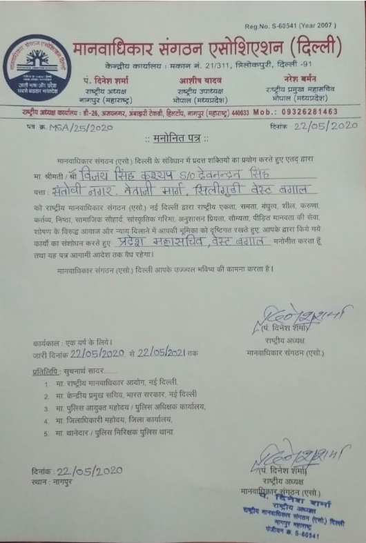 ऑल इंडिया चंद्रवंशी युवा एसोसिएशन के राष्ट्रीय कोषाध्यक्ष विजय सिंह कश्यप को मानवाधिकार संगठन के पश्चिम बंगाल के प्रदेश महासचिव नियुक्त किया गया।